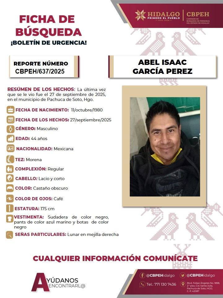 La Comisión de Búsqueda de Personas del Estado de Hidalgo (CBPEH) ha emitido un boletín de urgencia para localizar a Abel Isaac García Pérez, de 44 años, quien fue visto por última vez el pasado viernes 27 de septiembre de 2025 en el municipio de Pachuca.