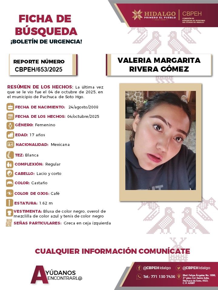 Se ha emitido un boletín de urgencia ante la desaparición de Valeria Margarita Rivera Gómez, una adolescente de 17 años, quien fue vista por última vez el pasado 4 de octubre de 2025 en el municipio de Pachuca de Soto.